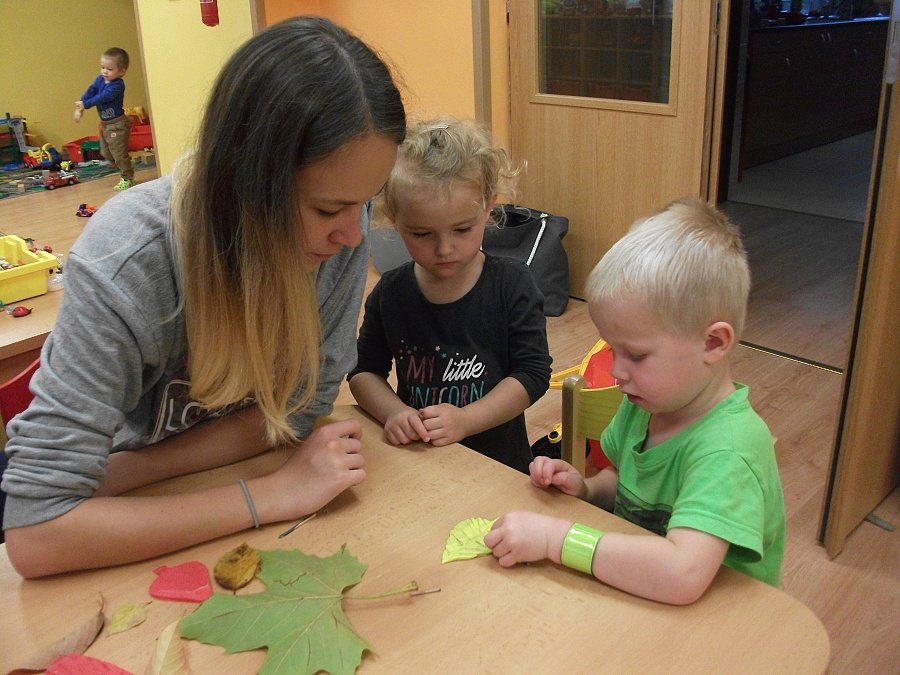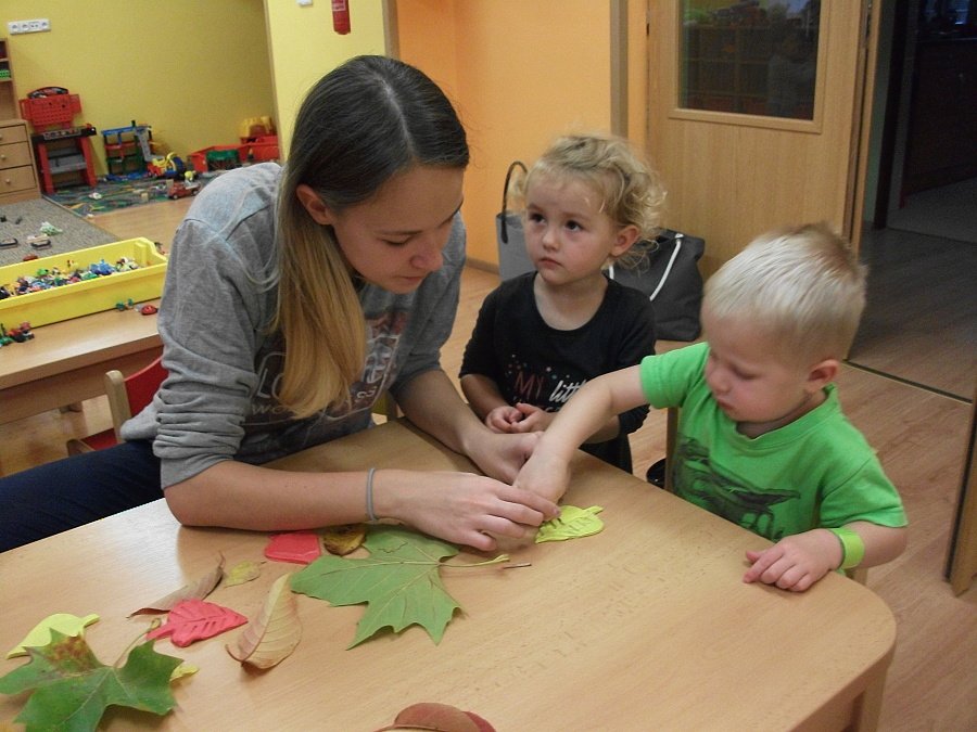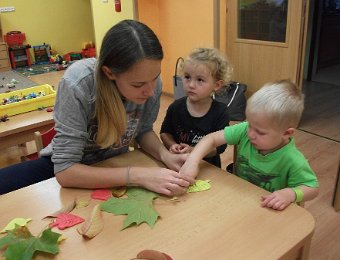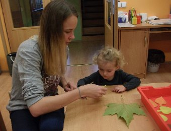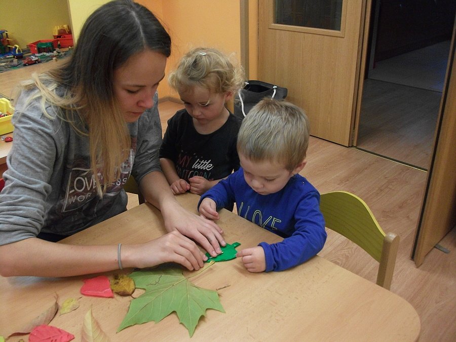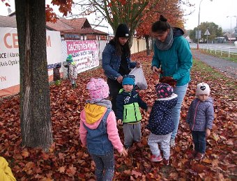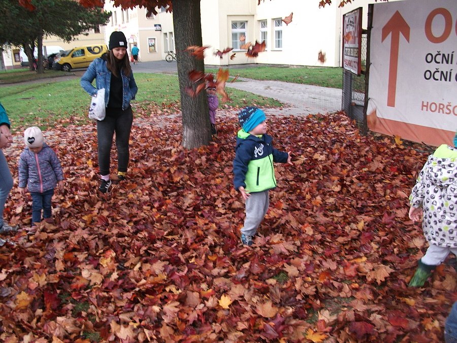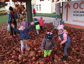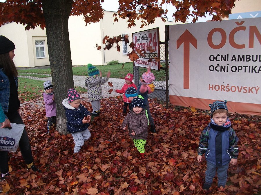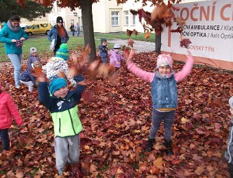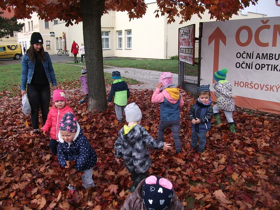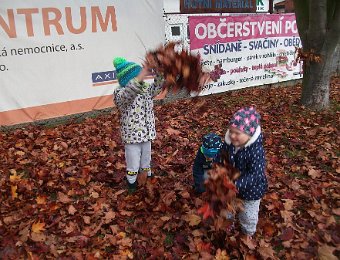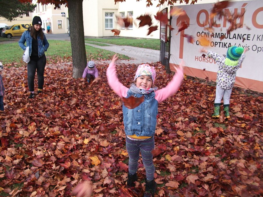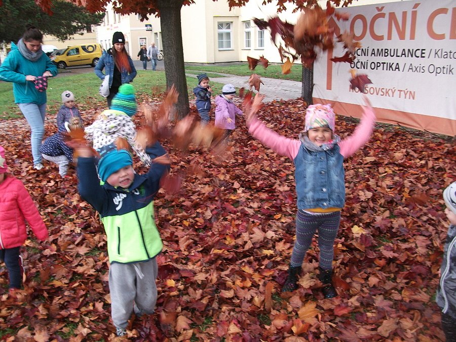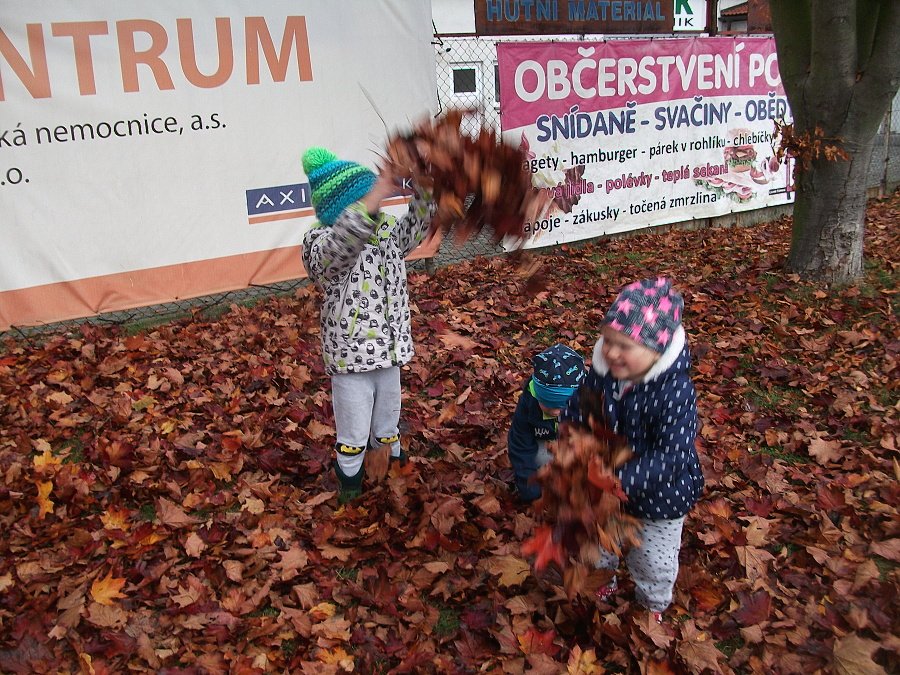 Pestře zbarvený podzim přímo vybízí k radostným hrám: pobíhali jsme ve spadaném suchém listí a poslouchali, jak krásně šustí, vyhazovali jsme listy do vzduchu a pozorovali, jak padá, promnuli jsme jej v prstech a čichali, jak pěkně voní, ze sesbíraného listí jsme si vytvořili barevné kytice apod. Z nejkrásnějších lístků jsme si udělali výstavku, pozorovali rozdíly nejen v barvách, ale i ve tvarech a velikostech, následovalo otiskování na větvičky stromu a nakonec jsme lístky tvořili z modelíny.